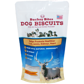 It's widely known that deer and elk antlers offer wonderful health benefits for dogs. They are an excellent source of vitamins, minerals, and calcium. BuckeyBites has created the world’s first tasty dog biscuit that combines the convenience of an edible treat with all the benefits of antlers. BuckeyBites Oven Baked Dog Biscuits made with All Natural Antler Powder provide all the benefits of antlers in a daily, tasty treat. We've also included Glucosamine, Carotene and Chondroitin in the mix to super charge their effectiveness. These biscuits help to promote sound bones and joints, and the overall well-being of your pet. They contain no wheat, no soy, and no corn. They are easy to digest and 100% made in the USA.